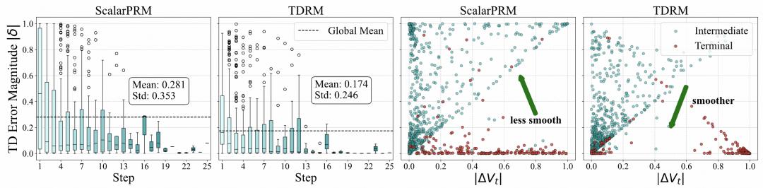 平滑性是推理过程中有效奖励建模的一个重要特性,因为其反映了中间步骤中价值更新的一致性和稳定性,确保推理轨迹的微小变化不会导致价值估计的不成比例的偏差。为评估平滑性,团队采用两种互补方法来对比 ScalarPRM 和 TDRM 的表现。