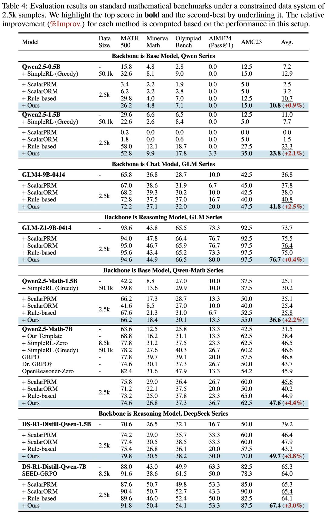 更进一步,当与可验证奖励强化学习(RLVR)结合时,经过 TD 训练的过程奖励模型能够实现更高数据效率的强化学习——仅用 2.5k 数据就能达到基线方法需要 50.1k 数据才能达到的相当性能——并在 Qwen2.5-(0.5B, 1.5B)、GLM4-9B-0414、GLM-Z1-9B-0414 等 8 种模型变体上得到更高质量的语言模型策略。