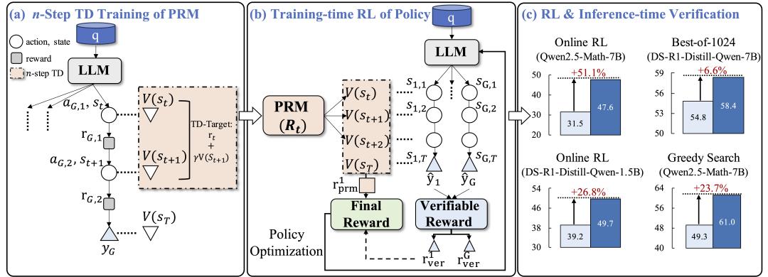 - TD-λ:相比于 n 步时间差分,TD-λ 是一种具有更高灵活性的在线算法。由于其在线特性,TD-λ 允许过程奖励模型在观察到奖励后立即将信息传播到更早的状态。
