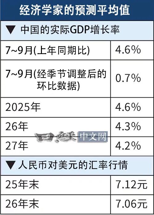 日本经济新闻和日经QUICK新闻日前汇总的中国经济学家调查。结果显示2025年7~9月中国实际国内生产总值(GDP)的预测平均值为同比增长4.6%。由于消费刺激政策效果减弱,内需疲软,预计增速将比4~6月的5.2%放缓。
