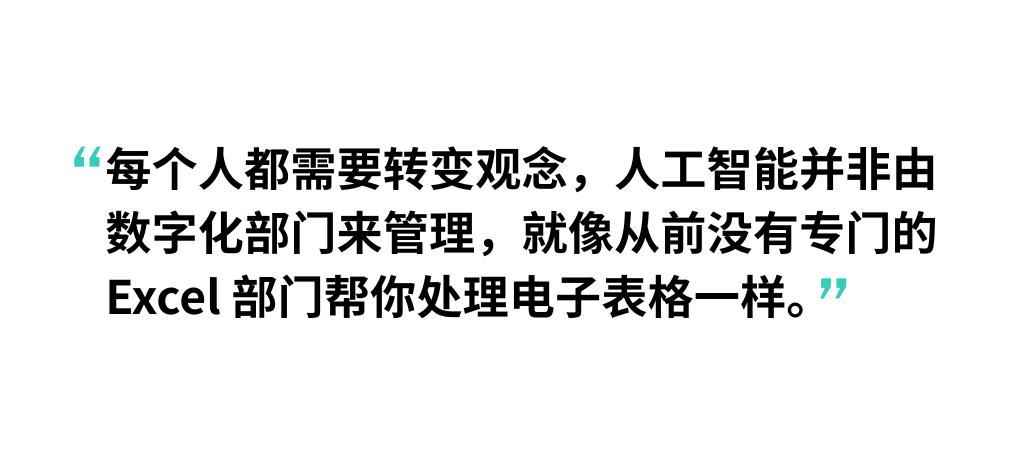 “每个人都需要转变观念,人工智能并非由数字化部门来管理,就像二十年前没有一个专门的Excel 部门帮你处理电子表格一样,这是我们每个人都需要拥抱的事情。”Kilshaw表示。