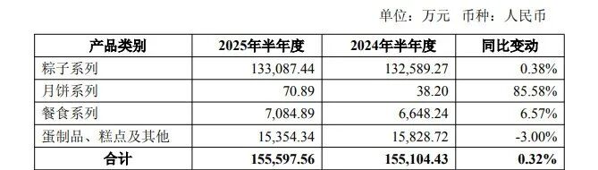 尽管产品已经覆盖了四季消费,但目前来看,餐食、蛋制品等品类,在总营收的占比相对有限。今年上半年,除粽子外的三大产品类别,合计实现营收仅2.25亿元,不足粽子业务营收的2成。