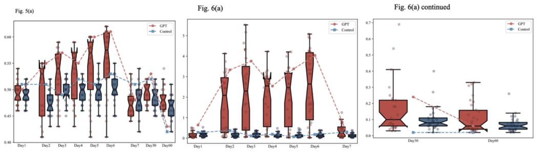 - 创造力的提升是短暂、不可持续的:在使用AI的阶段(第2-6天),“AI实验组”的各项创造力指标确实远超“纯脑力组”。然而,一旦AI被撤走,这种优势便瞬间消失。从第7天开始直到第60天,两组的创造力表现再无显著差异。更令人警醒的是,在第60天的聚合思维测试中,实验组的参与者表现甚至显著差于从未用过AI的对照组,AI带来的,并非可迁移的“能力”,更像是一种无法内化的“幻觉”。