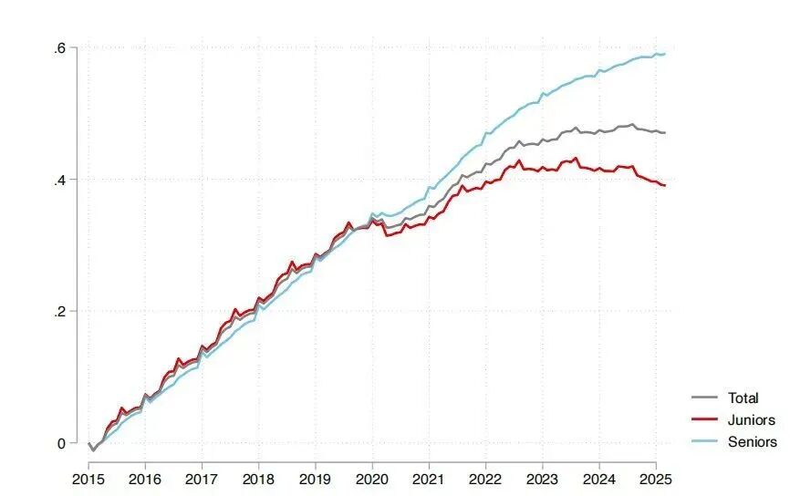 数据显示,2015到2022年间,初级和高级岗位的就业增长曲线基本保持一致,但从2023年开始,两者开始出现分叉:高级岗位继续向上增长,初级岗位则开始掉头向下。