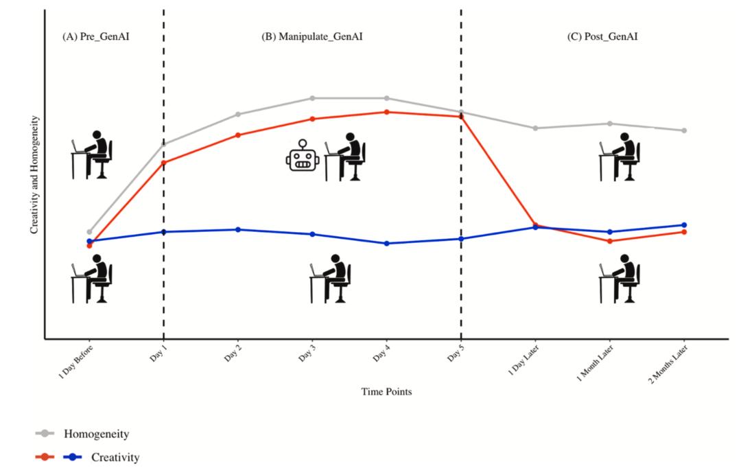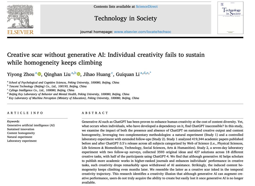 Zhou, Y., Liu, Q., Huang, J., & Li, G. (2025). Creative scar without generative AI: Individual creativity fails to sustain while homogeneity keeps climbing. Technology in Society, 103087.