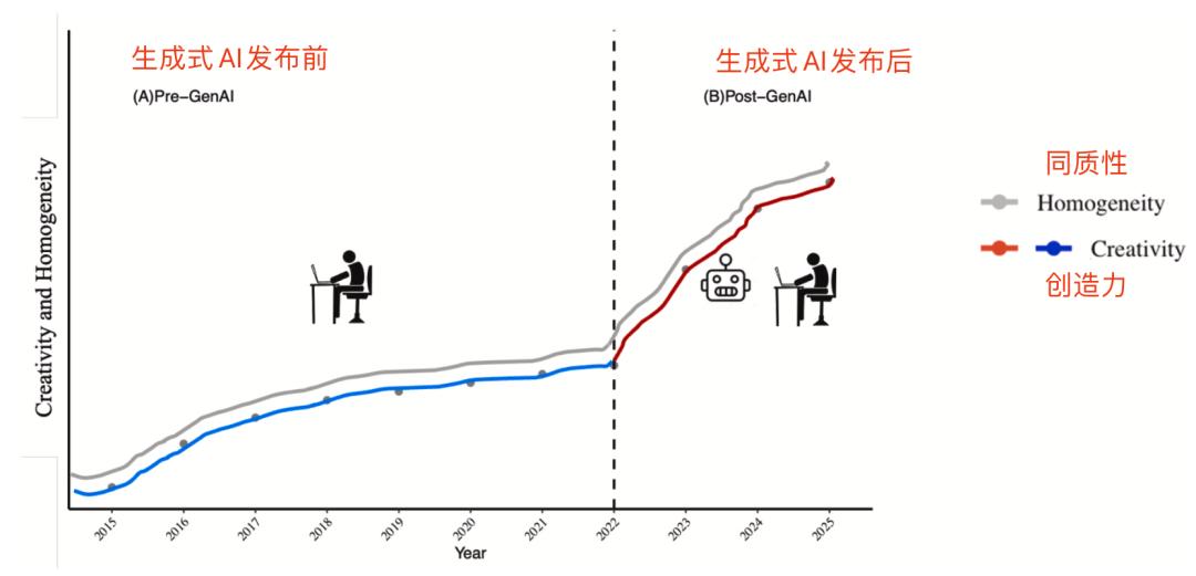 生成式AI发布前后学术界论文同质性和创造力结果示意图