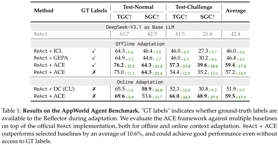 通过动态优化输入上下文,ACE 实现了智能体的自我改进。在 AppWorld 基准上,ACE 在无需标注数据的情况下,仅凭执行反馈就能提升性能高达 17.1%,使开源小模型的表现接近最强商用系统。