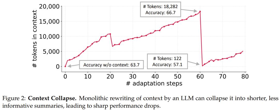 其二是「上下文塌缩」(context collapse):依赖 LLM 对整体提示进行重写的方式,往往会随着时间推移退化为更短、更模糊的摘要,从而造成性能骤降(见图 2)。在诸如交互式智能体、领域特定编程、以及金融或法律分析等任务中,系统性能依赖于保留细致的、任务相关的知识,而非将其压缩掉。