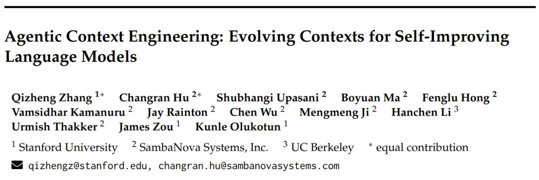 一篇来自斯坦福大学、SambaNova、UC 伯克利的论文近日引发了广泛讨论。他们提出了一种名为Agentic Context Engineering(智能体 / 主动式上下文工程)的技术,让语言模型无需微调也能实现自我提升!