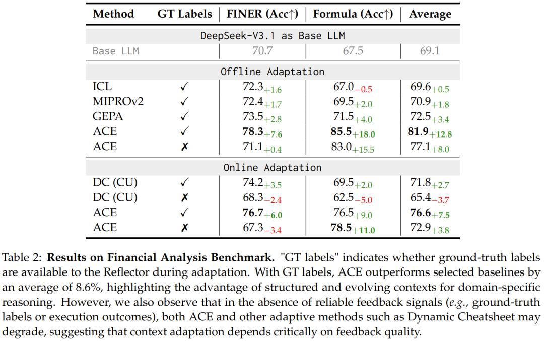 同时,ACE 也能大幅提升在领域特定任务上的表现:在复杂的金融推理任务中,ACE 通过构建含丰富领域知识的「作战手册」,平均性能提升 8.6%。
