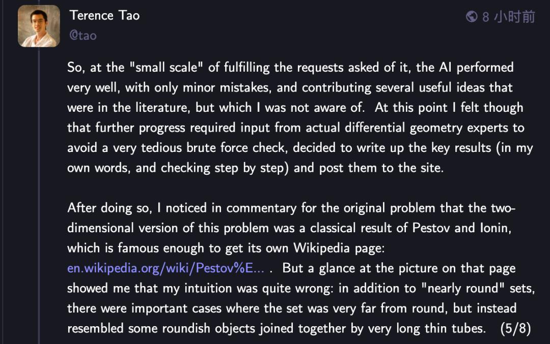 在“中等尺度”的策略上,AI略微显得无益,它强化了陶哲轩对问题的错误直觉,而不是提出质疑。