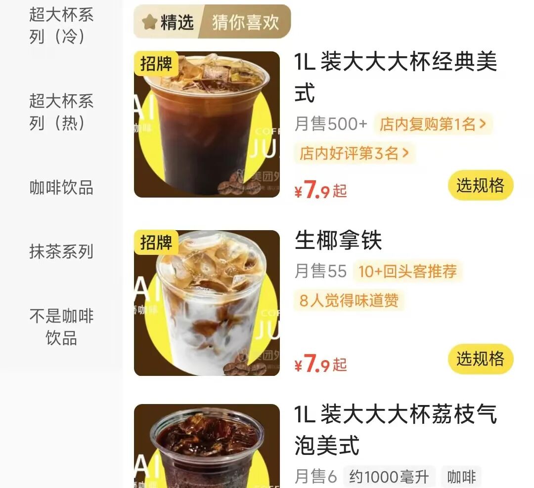 可以说,创意咖啡是这家店的引流款,用话题感低成本获客,顾客到店后再通过便宜大碗的1L装的美式/拿铁留住顾客,最终在附近2公里内吸引到足够多的复购顾客,一家店就持续有生意。