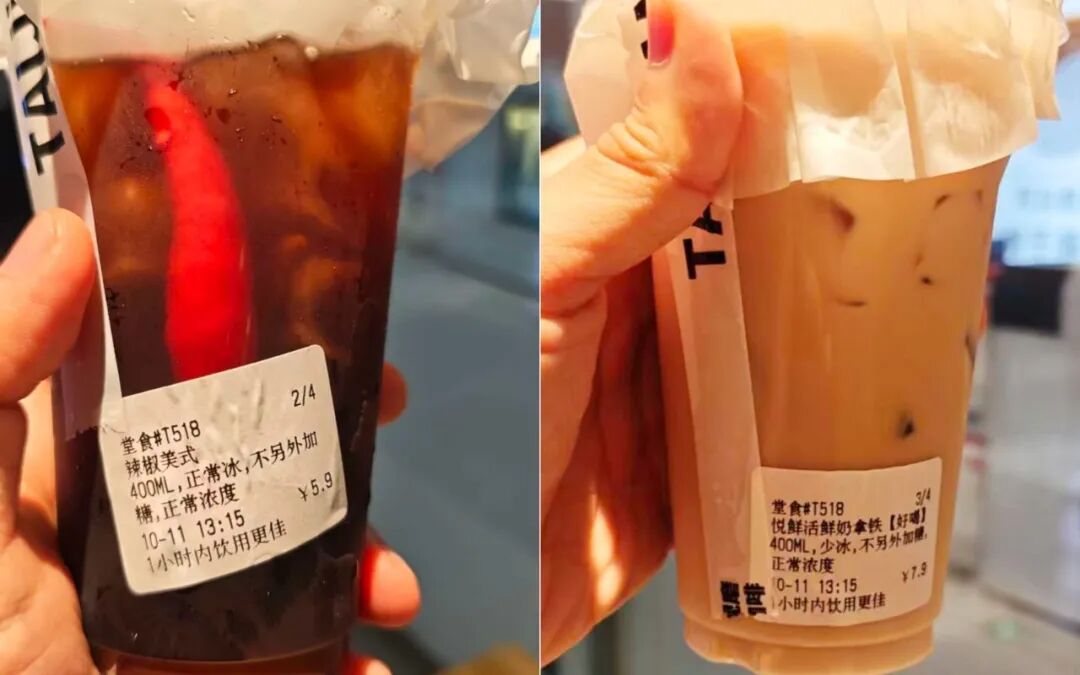 外卖平台上酸辣汤咖啡标注“巨难喝”,里面有醋有辣椒,网友评“喝一口毕生难忘”;辣椒美式里有一整根红红的小米椒,点单时店员还会询问,能吃辣就把辣椒多捣压几次。