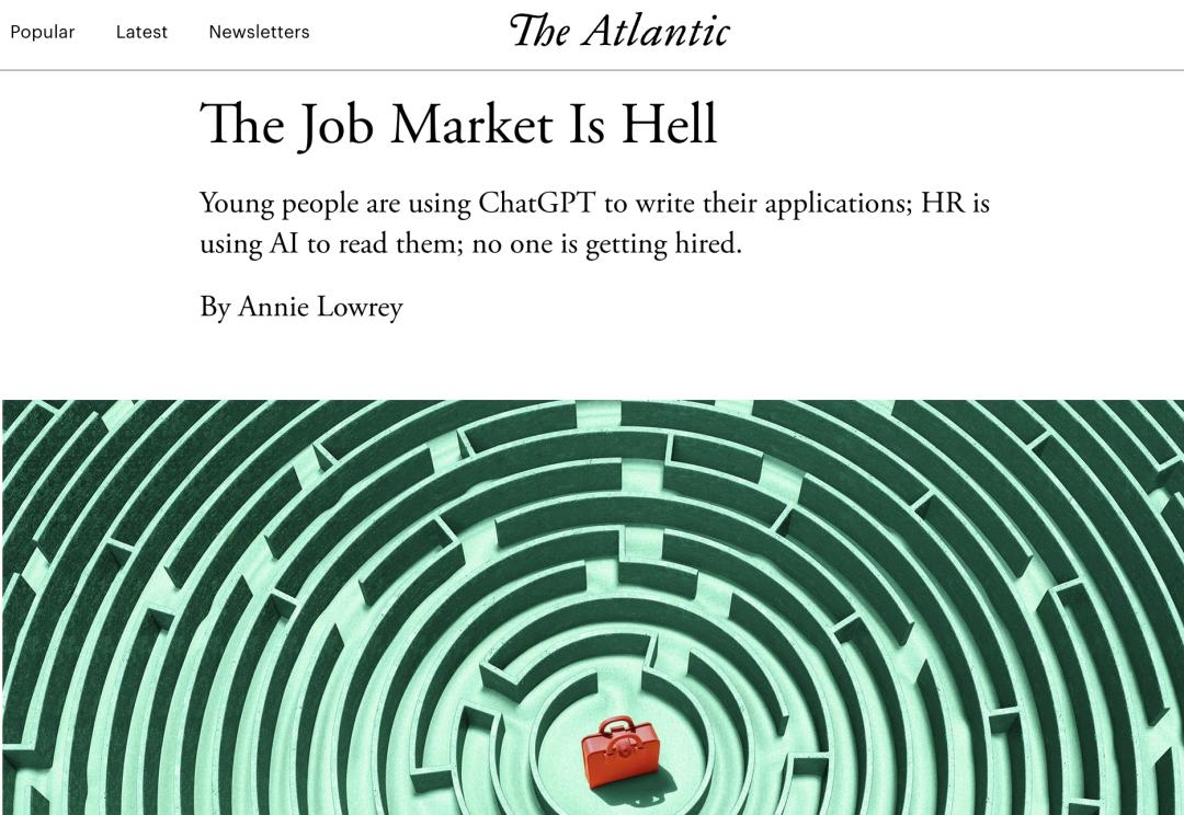 于是,在某些场景中又出现了令人啼笑皆非的闹剧。前不久《大西洋月刊》 刊登了一篇标题直白的文章:就业市场简直就是地狱。文章描述了求职者和招聘经理都面临的令人沮丧的境况:「年轻人用 ChatGPT 写申请,HR 用 AI 阅读申请,结果却没人被录用。」