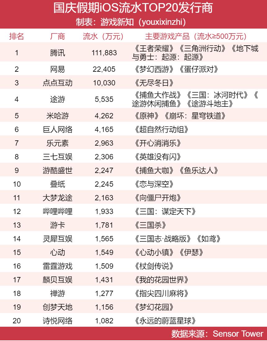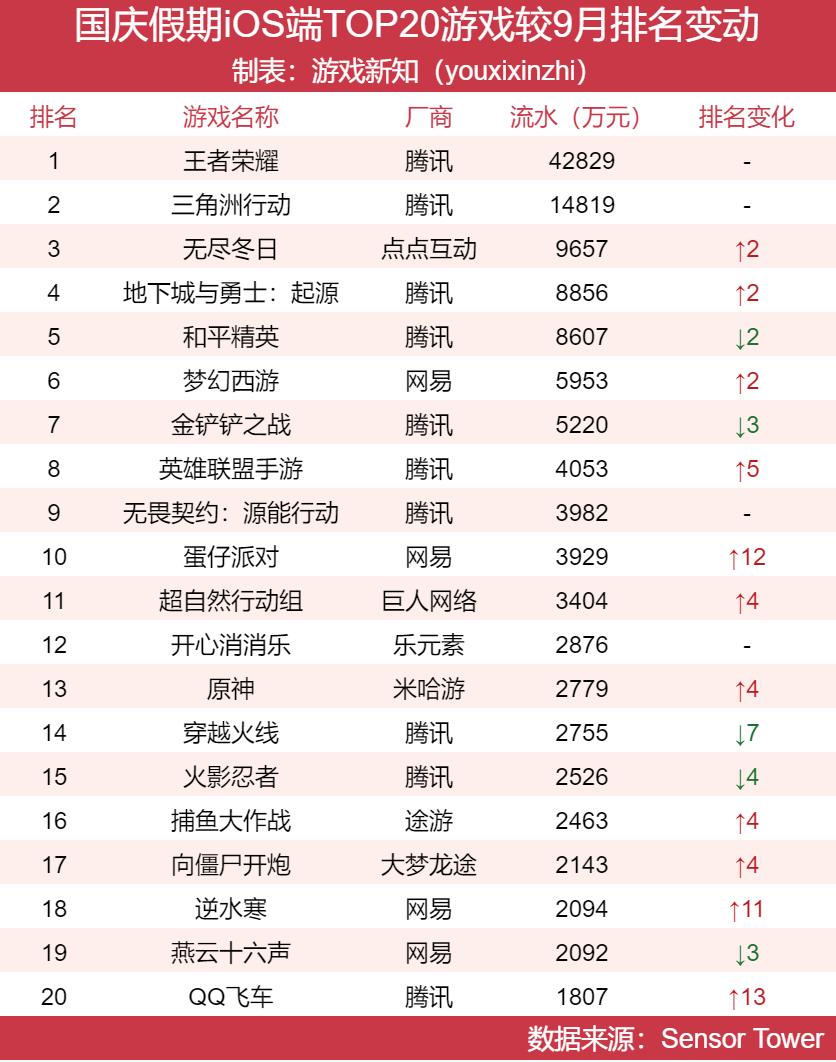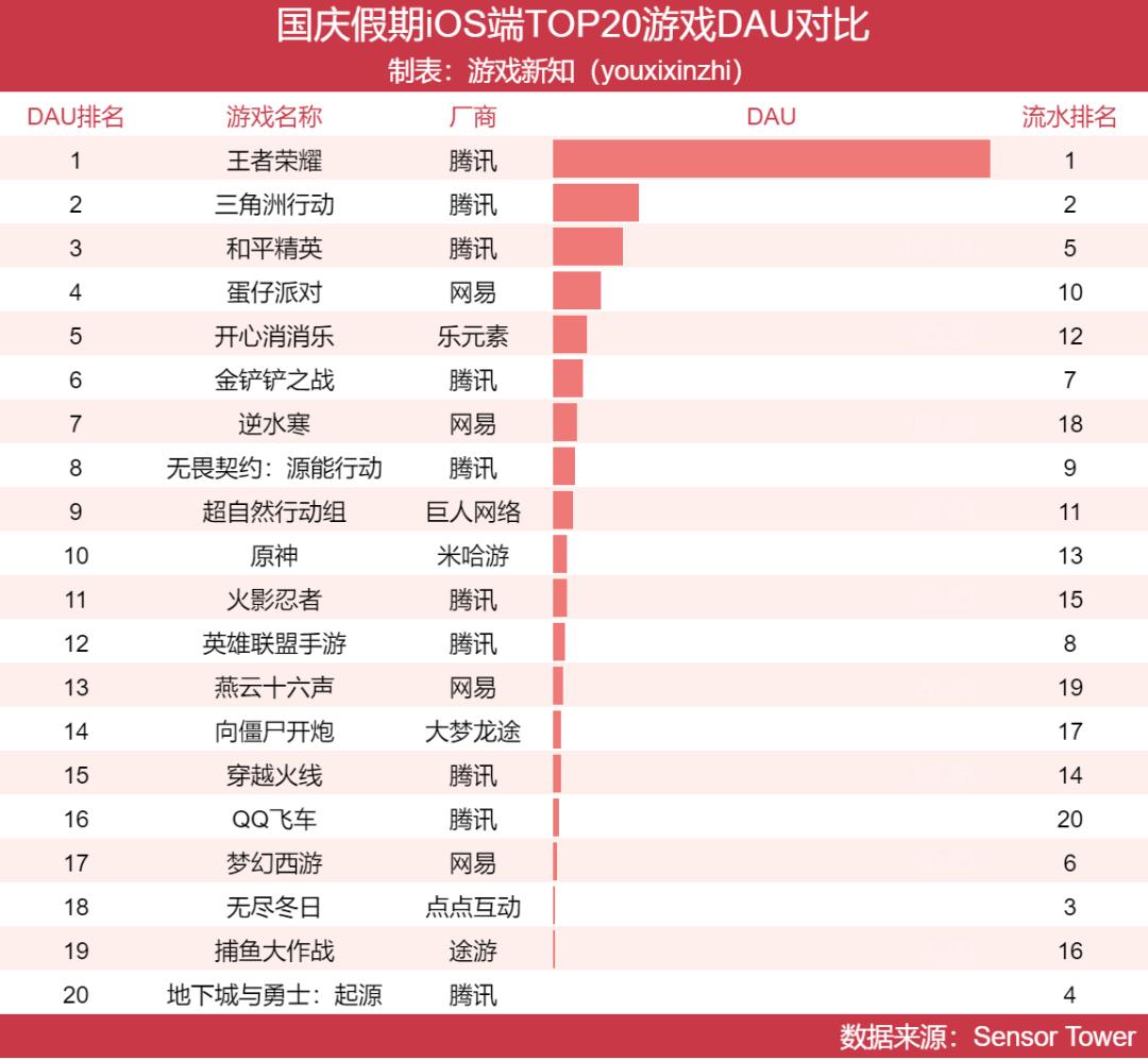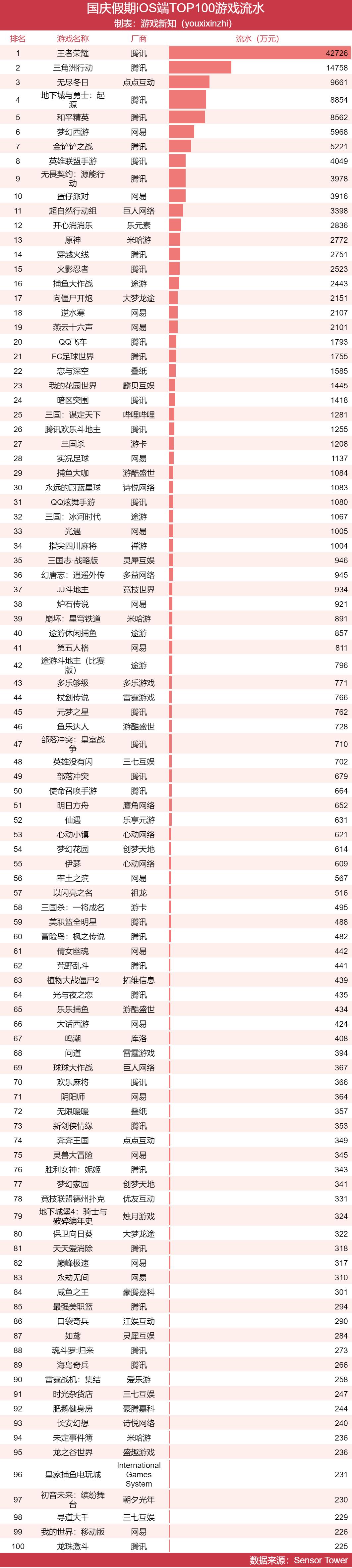 游戏新知对国庆假期TOP游戏的流水做了统计。