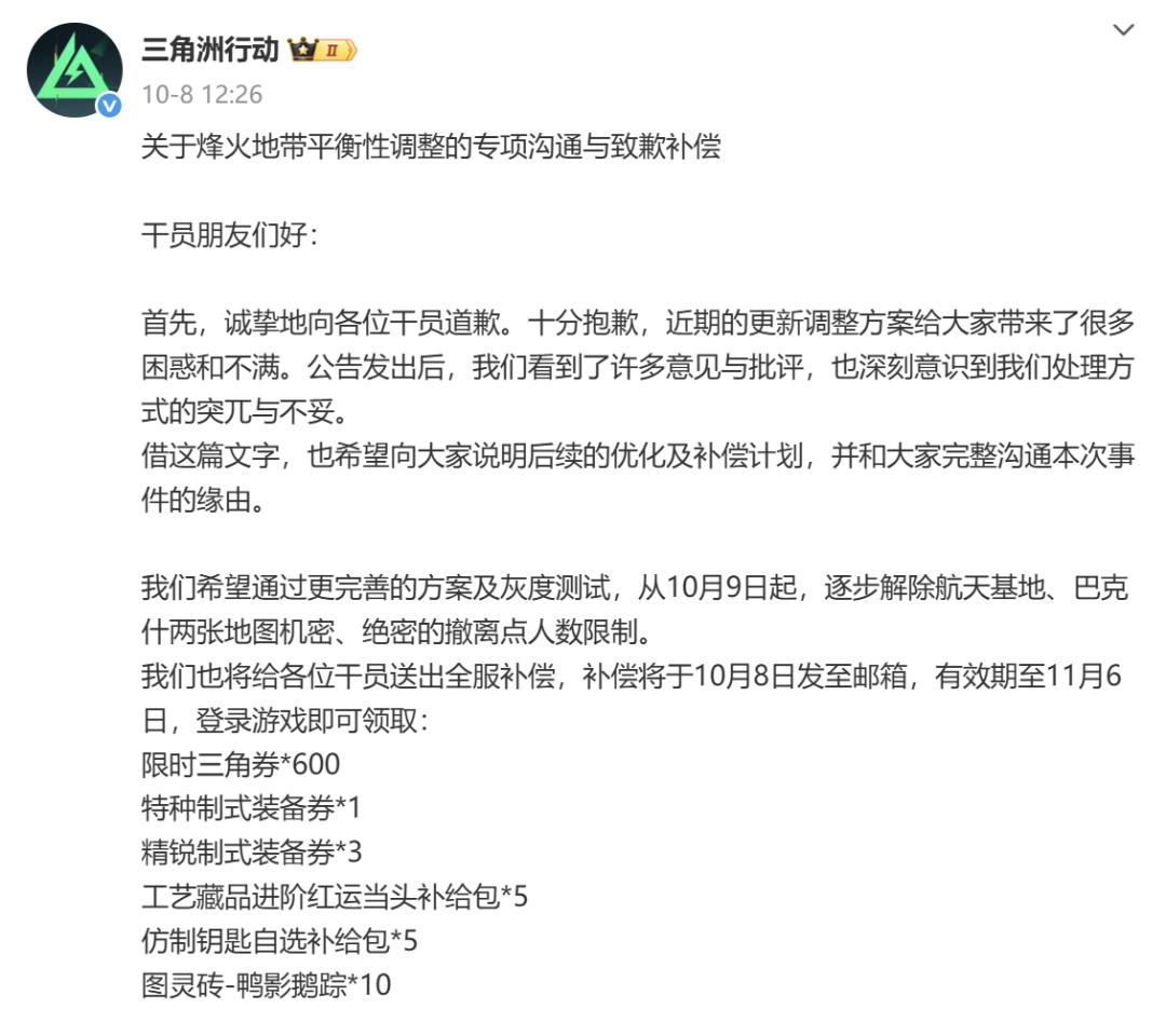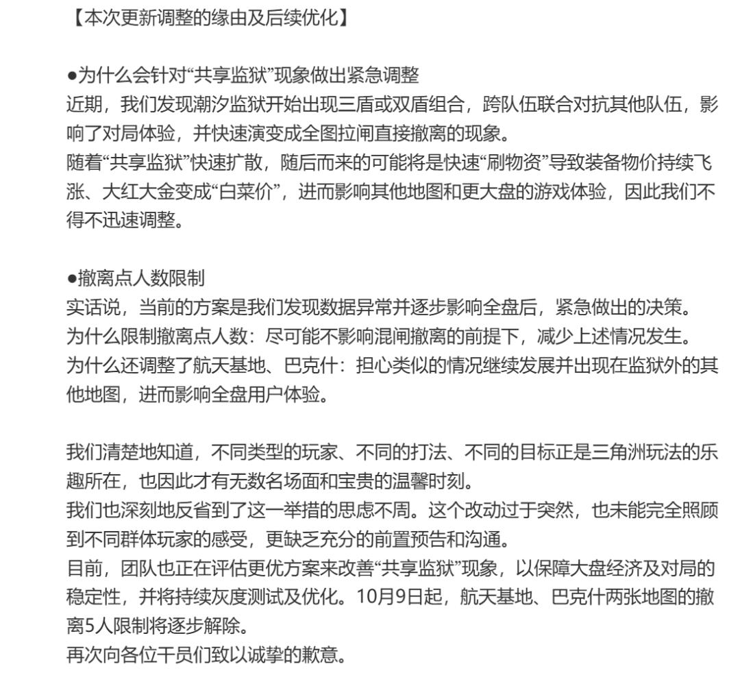 《三角洲行动》原本可能还能赚更多。最近恰逢上线一周年,游戏内发放了不少可免费领取的福利,上线了新的活跃度任务,又对部分玩法模式进行了内容更新。然而近期玩家逐渐在「潮汐监狱」地图中研究出了一种完全免战、合作共赢的套路,项目组认为其属于「不公平对战现象」。于是在5日,游戏进行了紧急更新,针对性地削弱了这套套路的合作可能性。此举引发大量玩家不满。8日,游戏不得不专门发布长文致歉,但玩家并不买账,甚至有一批玩家开始呼吁「10月10日集体罢游」。