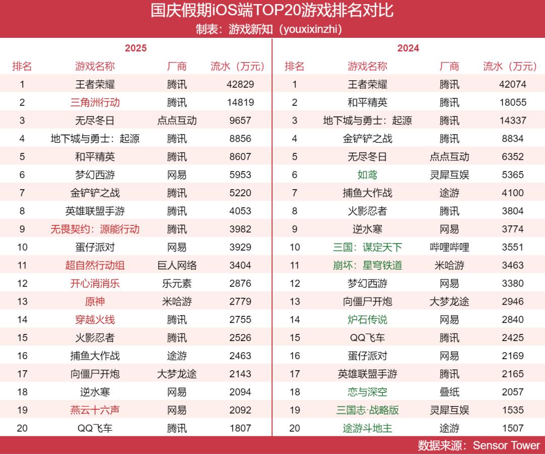上表中对比列出了今年与去年国庆假期的排名情况,并将今年新进TOP20的游戏和掉出TOP20的游戏突出标注。