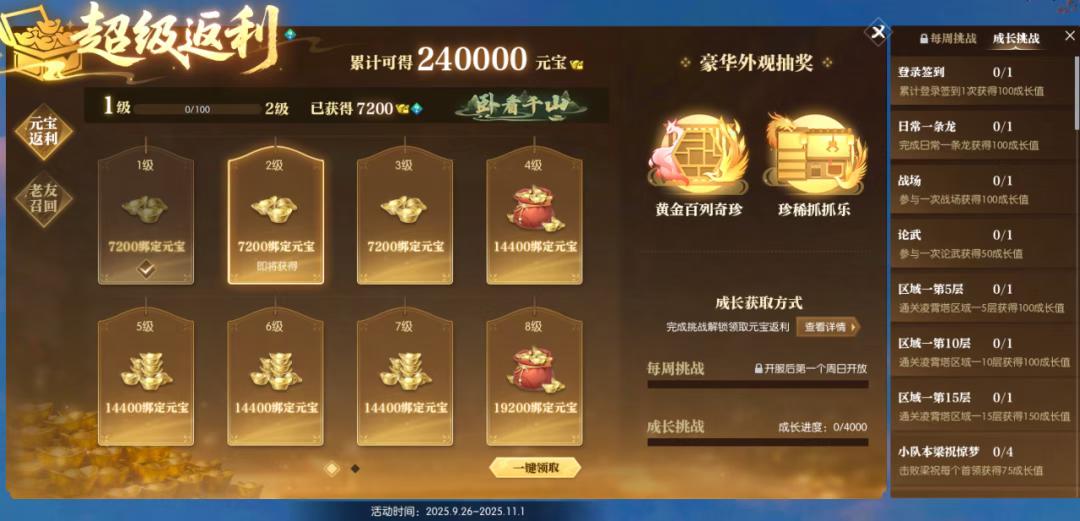 《逆水寒》大打福利牌,上线了黄金服的首个超级返利大区「凤鸣九霄」,可以根据账号历史充值金额和消费金额,按照一定比例返还游戏内付费货币。区服内还有大量福利活动,有的可以直接抽取过往的稀有外观,有的可以通过完成任务来提现。在长线上,这个新区的节奏偏缓,养成压力更小,还能将任务赚取的外观券领取至其他区服的角色。这对于老玩家回流应该格外有效果。