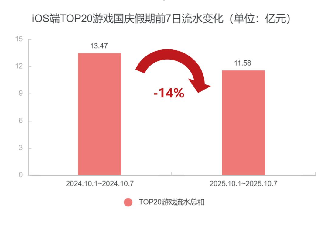 游戏新知将今年国庆假期的流水数据与去年国庆做了对比。TOP20游戏在国庆假期的收入能力相比上年同期有所下降,8天的收入(约13.28亿元)还要稍逊于去年同期的7天(13.47亿元),如果按前7天算更是减少了14%。