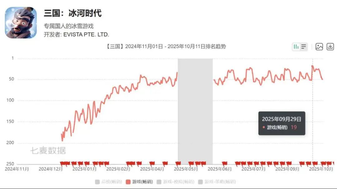 途游能在国庆假期爬到这个位置,除了旗下的休闲棋牌类游戏外,也有去年底上线的SLG《三国:冰河时代》一份功劳。这款游戏先在去年7月上线了小游戏市场,刚上线时成绩尚且不佳,过了三个月才慢慢爬升至小游戏畅销榜TOP10。APP端同样经历了一段缓慢的爬升过程,至今竟不断创下新高。