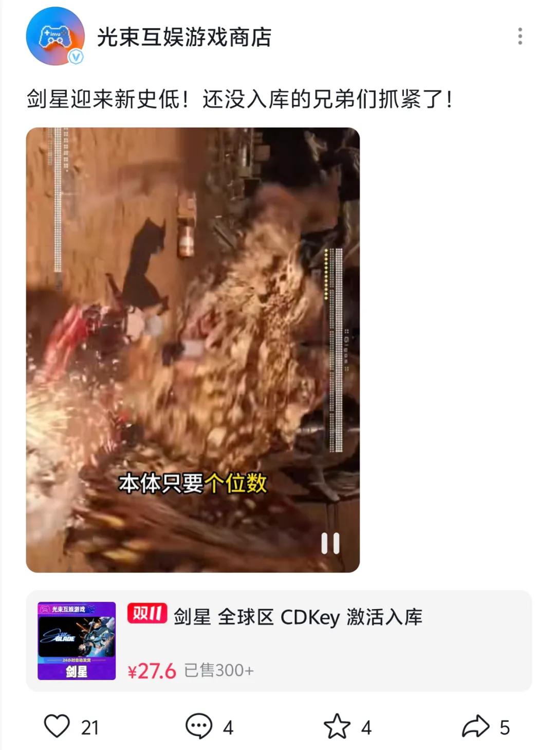 有时候小发刷个抖音,都能看到《剑星》史低 5 块钱这种广告。