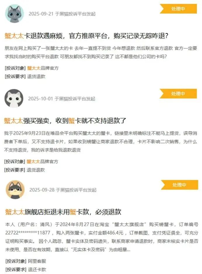 对提货遇阻感到不满的消费者,转头又在退卡流程上碰壁。仍以蟹太太为例,从第三方投诉平台上的帖文来看,仅在近期就出现了多起因为蟹太太蟹卡无法按照预期提货,想要退款时客服却提出需要找到原购买平台订单、找到实体卡片等要求。