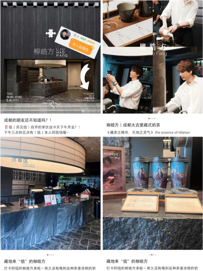 此外,在成都还有一家由歌手苏见信主理、主打“藏茶” 主题的品牌 —— 柳皓方,其产品包含盐系茶拿铁(如 “日照金山”)、花系鲜乳茶(如 “玫瑰拉姆”)、冷萃氮气茶(杏子藏茶、金花藏茶)与冰川果蔬茶,定价约 15–26 元,开业后人气持续走高。