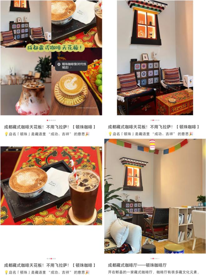 而在成都和北京也不少藏式咖啡馆。如成都的顿珠咖啡馆,位于郫都区,由阿坝州藏族小伙创办,店内布满经幡、木质家具与藏式彩绘,镇店之宝“送送巴雅母” 藏式咖啡用传统藏式铜杯盛放,吸引众多顾客。