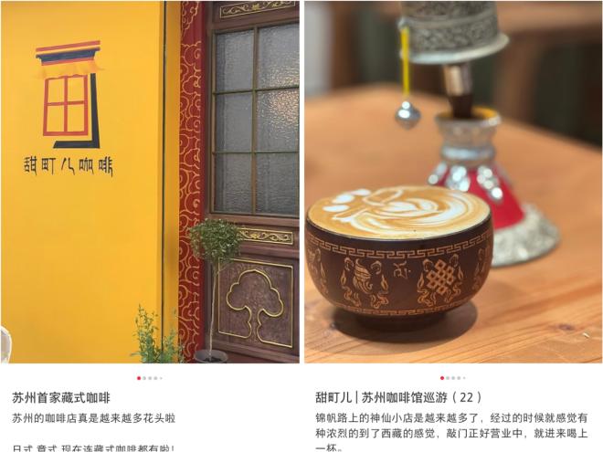 而在兰州更有西番咖啡,店内采用壁画等元素,打造藏地文化的沉浸式体验;苏州也有甜町儿咖啡,门店外墙刷成明黄色,搭配藏式风格门窗,尽显藏式风情。