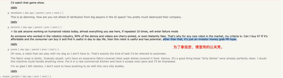 除此之外,在创业孵化器Y Combinator运营的科技社区Hacker News上,一些活跃在人形机器人岗位的从业者发表的评论也非常直接: