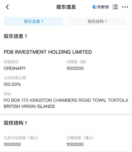 其后,记者通过天眼查平台查询得知,一家名为PD8 INVESTMENT HOLDING LIMITED的公司全资控股鹏海控股,其注册地址为PO BOX 173 KINGSTON CHAMBERS ROAD TOWN, TORTOLA BRITISH VIRGIN ISLANDS(英属维尔京群岛托托拉岛金斯顿钱伯斯路镇邮政信箱173号)。