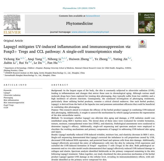 优时颜的拉帕乔提取物也是能够调节皮肤免疫的一个优秀成分。2024年优时颜发表在Phytomedicine上关于拉帕乔成分的作用机理研究的论文,通过单细胞测序的技术,发现拉帕乔可以通过调节免疫抑制,缓解皮肤光老化,提升皮肤免疫力,让皮肤在光损伤的情况下更快得到修复。