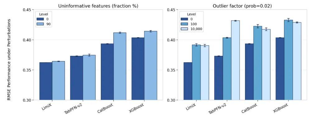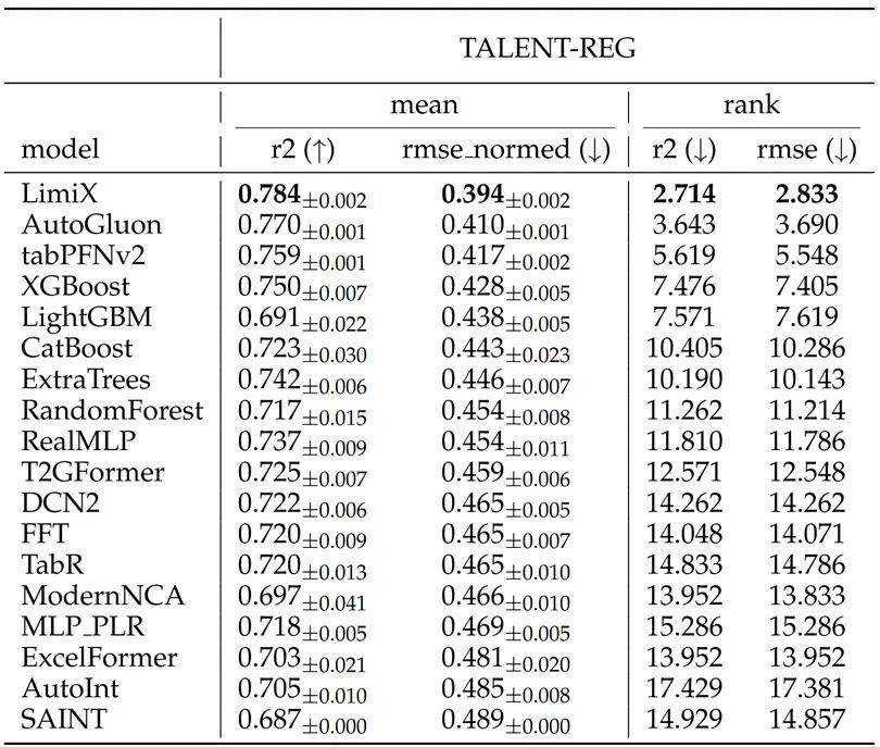 在回归任务上,“极数”大模型在R2和RMSE指标上都达到了平均最优,对比其他最优模型展现出了明显的优势。并且在数据集中有干扰特征或无效特征时,性能优势更加明显。