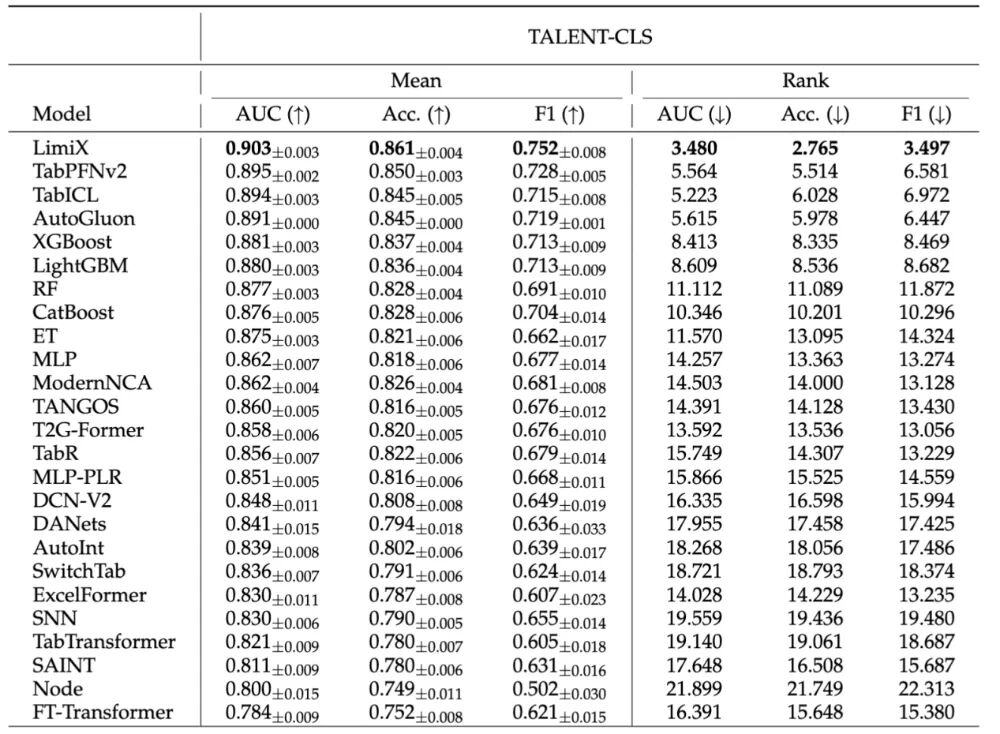 “极数”模型在评测方面,选取了各个领域的权威数据集作为Benchmark。如开源数据集Talent,它包含上百个真实数据集,是当前领域内体量最大、最具代表性的基准之一。在分类任务中,对比“极数”与24个领域内的最优模型,“极数”大模型的模型性能显著超越其他模型,在AUC、ACC、F1Score和ECE上均取得了最优。