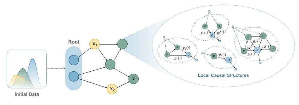 不同于传统的树模型和基于transformer架构的通用语言大模型,“极数”大模型在预训练过程中完全使用生成数据,不依赖于任何真实世界的数据来源。为了使数据生成的过程高效且可控,团队使用了基于结构因果图的数据生成方式:采样到的初始数据在有向无环图上进行传播,通过复杂的边映射和节点交互来模拟现实世界中不同的因果依赖关系;通过对因果图上的生成数据进行采样,最终获得训练数据中的特征X和目标Y。使用这种方法生成的数据,既实现了因果结构上的多样性,又保证了数据的可控性。
