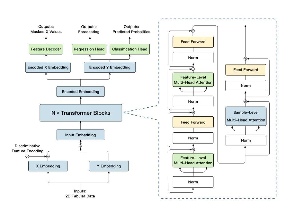 “极数”大模型沿用了transformer架构,并针对结构化数据建模和任务泛化进行了相关的优化。“极数”大模型先对先验知识库中的特征X和目标Y分别进行embedding;之后在主要模块中,在样本和特征维度上分别使用注意力机制,来聚焦关键样本的关键特征。最终,提取到的高维特征被分别传入regressionhead和classificationhead,实现对不同功能的支持。