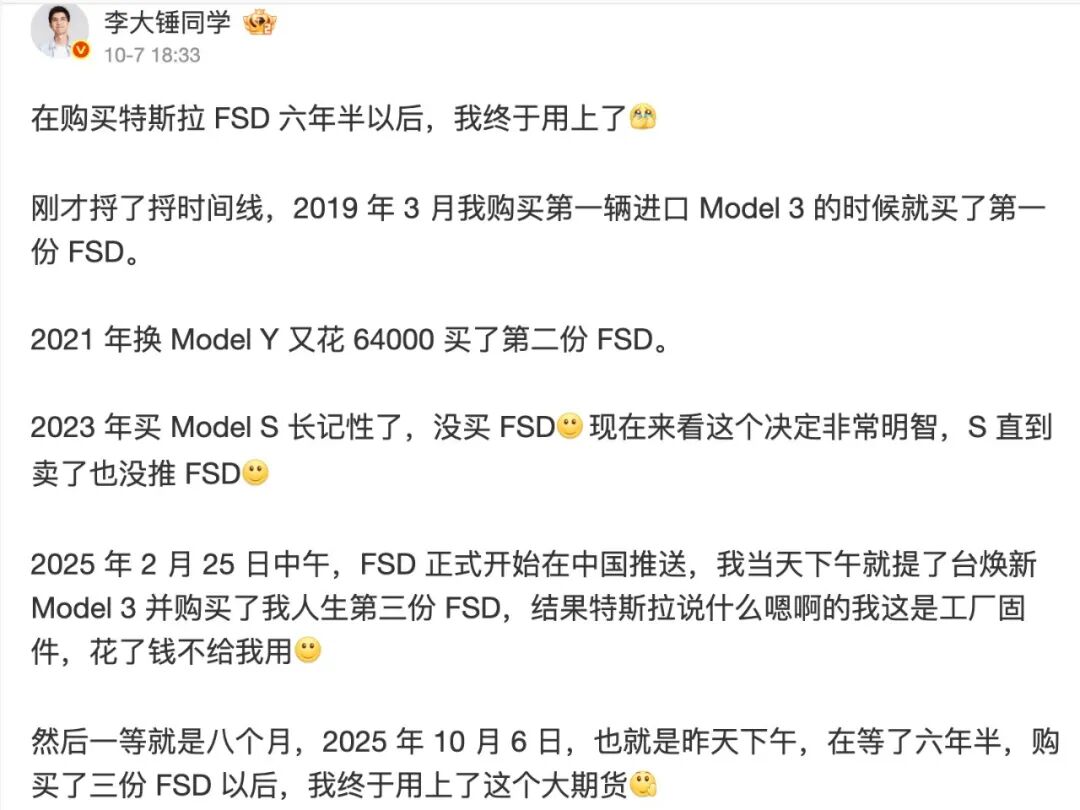 就目前来看,特斯拉FSD V14.1仅面向北美用户。但值得关注的是,据博主@李大锤同学透露,在连续购买三份FSD后,他今年2月提车的Model 3于10月6日终于通过升级至V13.2.9版本成功启用FSD,实测功能完全可用。