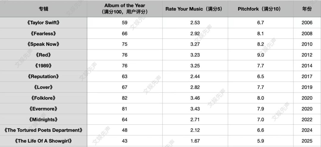 若将时间线拉长便会发现,自2022年的《Midnights》开始,尽管其商业成绩屡创新高,但在核心乐迷社群和乐评网站中的声誉却在悄然下行。