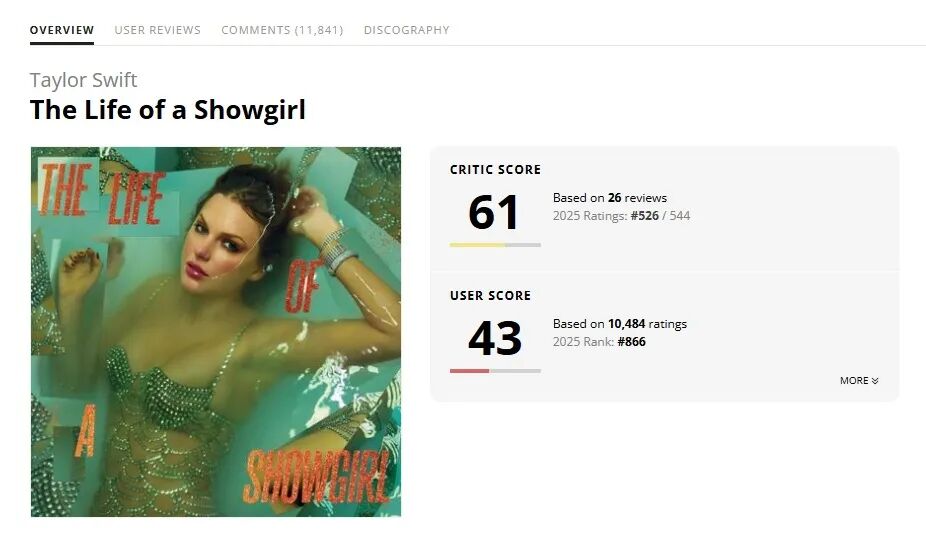 不只是专业媒体,《The Life of a Showgirl》在乐迷群体中也造成了割裂。无论是国内还是国外,在社交媒体上,关于这张专辑“旋律平淡”与“歌词尴尬”的批评不绝于耳。目前,在Album of the Year上,其用户评分已滑落至43分(满分100分);而资深乐迷平台Rate Your Music的评分更是低至1.67分(满分5分),双双触及其职业生涯的冰点。