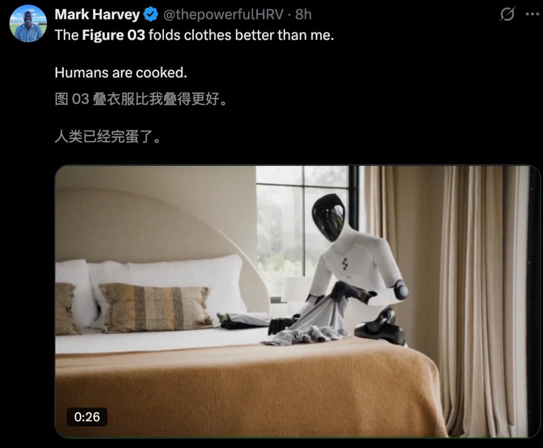 有网友对此惊呼,Figure 03叠衣服要比自己叠得好,人类「药丸」了。
