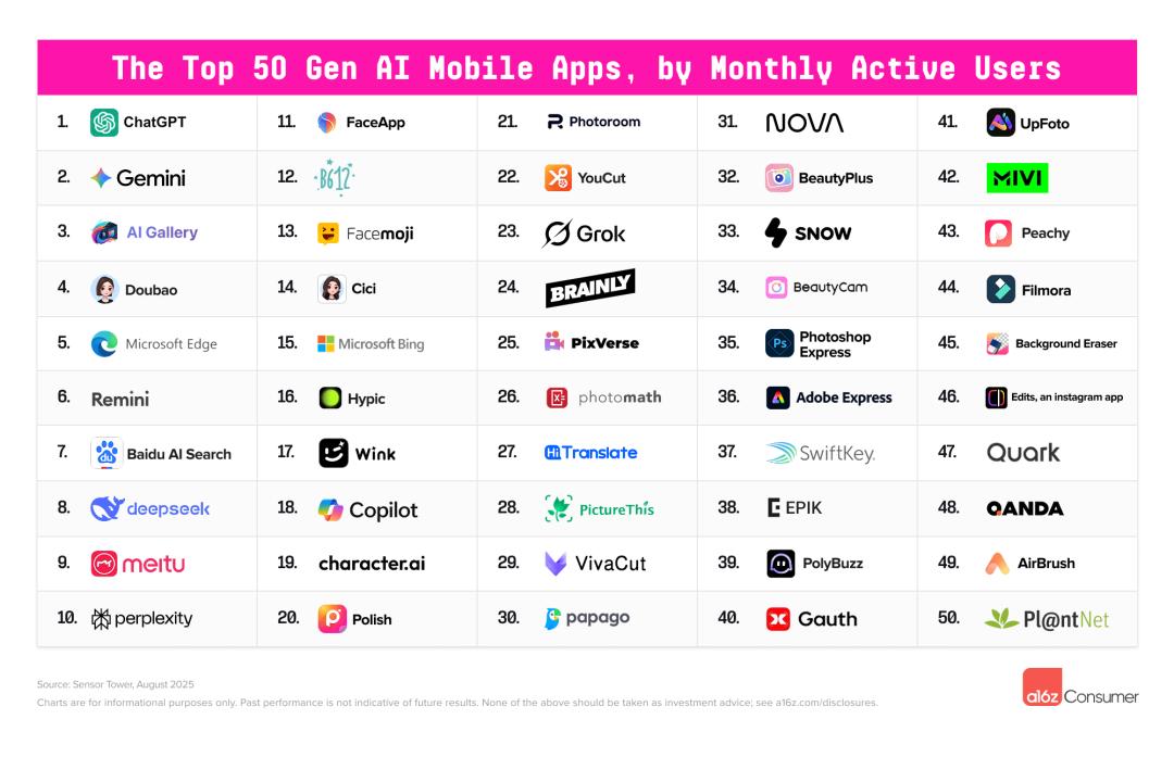 a16z发布的全球AI移动应用Top50中,22款中国产品上榜,其中19款主攻海外。