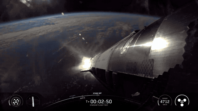 发射约 2 分半后,星舰上方飞船点燃自身的 6 台发动机并完成分离。据 SpaceX 介绍,这些火箭发动机产生的推力相当于 64 架波音 747 客机的总和。