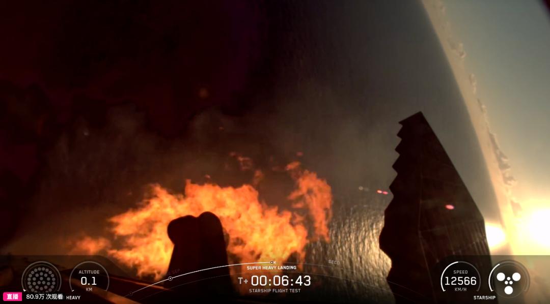 而「超级重型」助推器开始执行返回推进,朝预定溅落点飞行,准备进行着陆点火实验。
