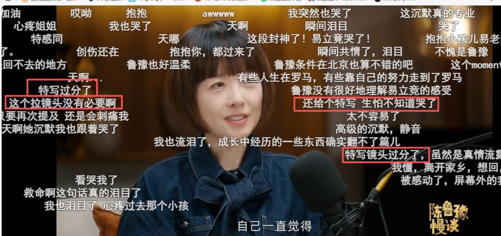 一是观众对于过度煽情的反感。现在看来,传统访谈节目和视频播客的区别并不在制作,而是在于受众,新一代观众,移动互联网的“原住民”,对于情感真实性、原发性的要求在不断提高,比如易立竞提到自己对于过去艰难的北漂生活片段原来没有释怀,流下热泪,这个时候镜头突然推进,刻意放大了易此刻的哭泣,弹幕纷纷表示感动的同时,也有观众表示这样的特写没有必要。对于这样一个宝贵的真情流露时刻,保持克制是更好的处理方式。
