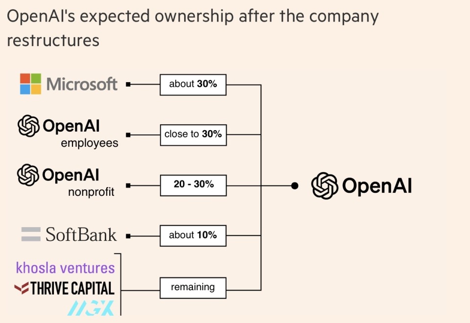 据知情人士披露,按照OpenAI当前拟定的方案,已注资逾130亿美元的微软作为OpenAI早期主要投资者,预计将成为最大单一股东,持股约30%;公司员工持股接近30%;控制集团的OpenAI非营利母公司持股约30%;剩余股权由软银(已承诺投资超300亿美元)、Khosla Ventures、Thrive Capital,以及OpenAI此前收购的乔纳森·伊夫(Jonathan Ive)硬件公司LoveFrom io股东瓜分。