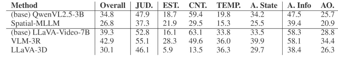 空间增强模型能做好吗?结果可能没那么乐观。「空间建模」机制的模型(如 Spatial-MLLM、VLM-3R 和 LLaVA-3D),与其基座模型相比没有预期的显著提升,反而在部分任务上明显退步,并伴随指令遵循能力的下降。总体来看,空间增强模型虽然在特定数据分布中表现良好,但在更开放、更复杂的在线场景中仍难以稳健发挥。这也进一步体现体现了 OST-Bench 在揭示模型真实能力边界方面的价值。