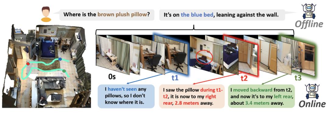 和现实中的人类一样,在真实世界部署的智能体通常无法一次性获取全局环境,而是依赖连续输入的局部观测,需要在不断「移步换景」中完成在线感知、记忆维护与时空推理。这对导航、移动操控等具身任务尤为关键:比如在导航中,模型需要在当前时刻判断「刚才见到的目标现在在我左后方」,并据此决定行动。