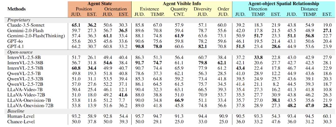 传统的静态场景理解主要关注物体属性及其静态关系。而探索的智能体中不断改变自身位置和视角,带来持续更新的信息类型与更丰富的问题形态。研究团队据此将动态场景理解划分为三大信息类别:智能体空间状态、智能体可见信息、智能体 – 物体空间关系。基于这三类信息,研究团队进一步设计了 15 个子任务,覆盖判断(JUD)、估算(EST)、计数(CNT)、时间定位(TEMP) 四类题型。基于规则生成 + 人工筛选,生成了基准的 10k 条测试集数据 (1.4k 个场景) 以及用于微调的 50k 条训练集数据 (7k 个场景)。
