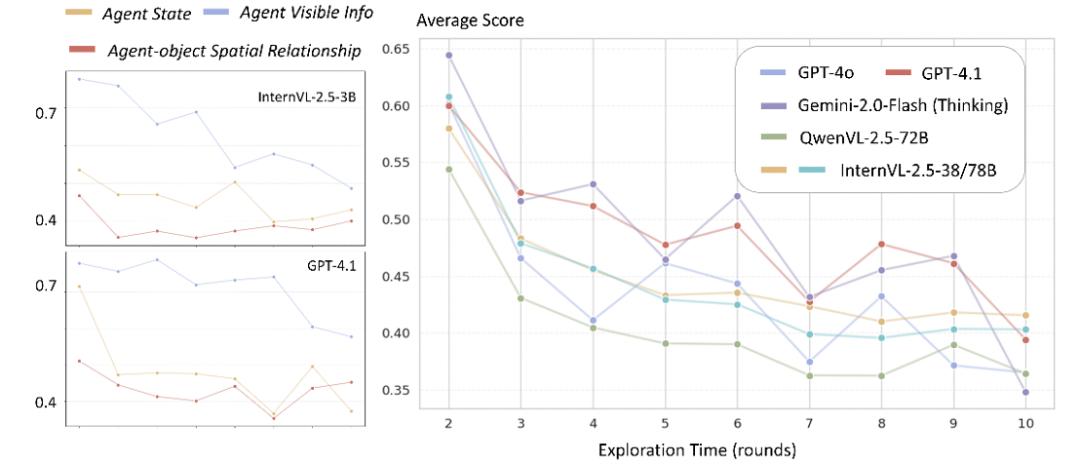 主流大模型陷入困境:当前主流多模态大模型与人类存在显著性能差距,暴露出跨时空信息推理的能力短板 (上面表 1 / 表 2)。模型的准确率随着探索步数的持续下降说明现有范式难以适应长时序的在线设定。