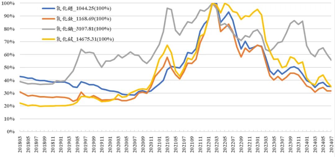 永磁类稀土氧化物月均价(人民币)变化图,来源:中国稀土行业协会(2024/07)